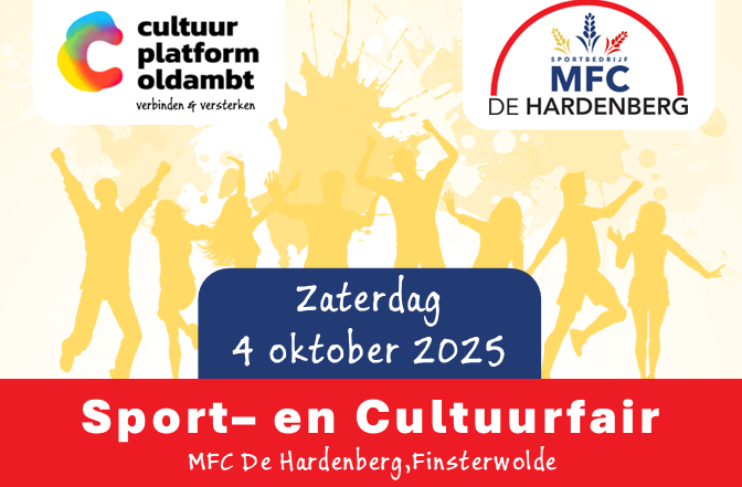 Op zaterdag 4 oktober organiseert het Cultuurplatform Oldambt samen met MFC De Hardenberg de Sport- en Cultuurfair. Het gehele programma is gratis en je kunt de hele dag binnenlopen.