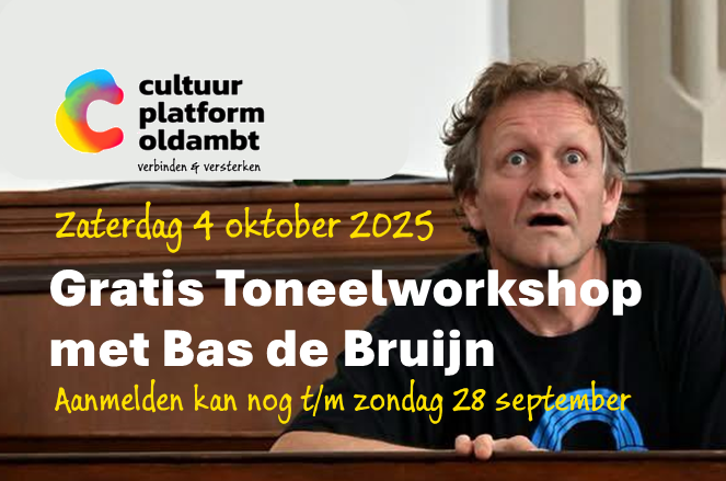 Daarom organiseert het Cultuurplatform Oldambt op 4 oktober samen met acteur/regisseur Bas de Bruijn een gratis toneelworkshop voor zowel regisseurs als spelers tijdens de Sport- en Cultuurfair in MFC De Hardenberg (Finsterwolde).